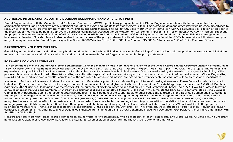 ADDITIONAL INFORMATION ABOUT THE BUSINESS COMBINATION AND WHERE TO FIND IT Global Eagle has filed with the Securities and Exchange Commission (SEC) a preliminary proxy statement of Global Eagle in con nec tion with the proposed business combination and will mail a definitive proxy statement and other relevant documents to its stockholders. Global Eagle stockho lde rs and other interested persons are advised to read, when available, the preliminary proxy statement, and amendments thereto, and the definitive proxy statement in connecti on with Global Eagle’s solicitation of proxies for the stockholder meeting to be held to approve the business combination because the proxy statement will contain important inf orm ation about AIA, Row 44, Global Eagle and the proposed business combination. The definitive proxy statement will be mailed to stockholders of Global Eagle as of a reco rd date to be established for voting on the business combination. Stockholders will also be able to obtain copies of the proxy statement, without charge, once available, at the SEC's Internet site at http://www.sec.gov or by directing a request to: Global Eagle Acquisition Corp., 10900 Wilshire Blvd., Suite 1500, Los Angeles, CA 90024 Attn.: Jam es A. Graf, Chief Financial Officer. PARTICIPANTS IN THE SOLICITATION Global Eagle and its directors and officers may be deemed participants in the solicitation of proxies to Global Eagle’s stock hol ders with respect to the transaction. A list of the names of those directors and officers and a description of their interests in Global Eagle is contained in the proxy statemen t. FORWARD LOOKING STATEMENTS This press release may include "forward looking statements" within the meaning of the "safe harbor" provisions of the United Sta ted Private Securities Litigation Reform Act of 1995. Forward - looking statements may be identified by the use of words such as "anticipate", "believe", "expect", "estimate", "p lan", "outlook", and "project" and other similar expressions that predict or indicate future events or trends or that are not statements of historical matters. Such forward l ook ing statements with respect to the timing of the proposed business combination with Row 44 and AIA, as well as the expected performance, strategies, prospects and other aspec ts of the businesses of Global Eagle, AIA, Row 44 and the combined company after completion of the proposed business combination, are based on current expectations that ar e subject to risks and uncertainties. A number of factors could cause actual results or outcomes to differ materially from those indicated by such forward looking sta tements. These factors include, but are not limited to: (1) the occurrence of any event, change or other circumstances that could give rise to the termination of the Row 44 Merger Agreement or the AIA Stock Purchase Agreement (the "Business Combination Agreements"), (2) the outcome of any legal proceedings that may be instituted against Gl oba l Eagle, AIA, Row 44 or others following announcement of the Business Combination Agreements and transactions contemplated therein; (3) the inability to complete the tra nsactions contemplated by the Business Combination Agreements due to the failure to obtain approval of the stockholders of the Global Eagle or other conditions to c los ing in the Business Combination Agreements, (4) delays in obtaining, adverse conditions contained in, or the inability to obtain necessary regulatory approvals or comple te regulatory reviews required to complete the transactions contemplated by the Business Combination Agreements; (5) the risk that the proposed transactions disrupt current pl ans and operations; (6) the ability to recognize the anticipated benefits of the business combination, which may be affected by, among other things, competition, th e a bility of the combined company to grow and manage growth profitably, maintain relationships with suppliers and obtain adequate supply of products and retain its key emp loy ees; (7) costs related to the proposed business combination; (8) changes in applicable laws or regulations; (9) the possibility that AIA and Row 44 may be adversely af fected by other economic, business, and/or competitive factors; and (10) other risks and uncertainties indicated from time to time in the proxy statement, including tho se under “Risk Factors” therein, and other filings with the SEC by Global Eagle. Readers are cautioned not to place undue reliance upon any forward - looking statements, which speak only as of the date made, and Global Eagle, AIA and Row 44 undertake no obligation to update or revise the forward - looking statements, whether as a result of new information, future events or other wise. 1