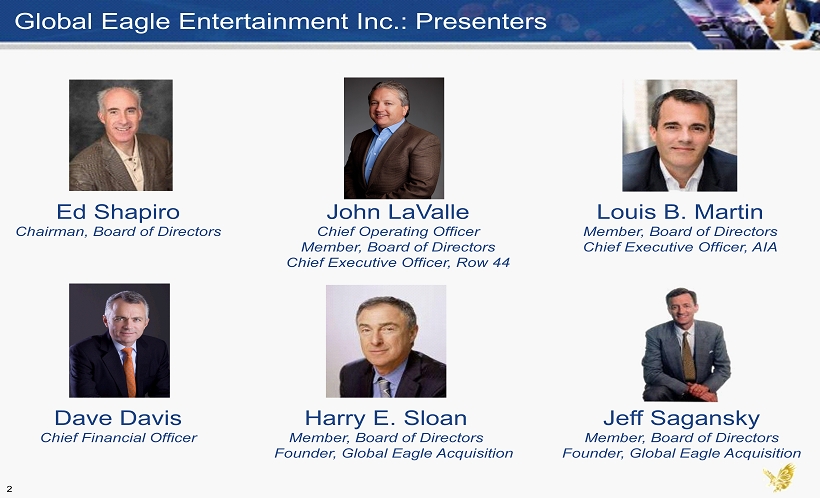 Global Eagle Entertainment Inc.: Presenters Harry E. Sloan Member, Board of Directors Founder, Global Eagle Acquisition Jeff Sagansky Member, Board of Directors Founder, Global Eagle Acquisition Dave Davis Chief Financial Officer John LaValle Chief Operating Officer Member, Board of Directors Chief Executive Officer, Row 44 Ed Shapiro Chairman, Board of Directors Louis B. Martin Member, Board of Directors Chief Executive Officer, AIA 2