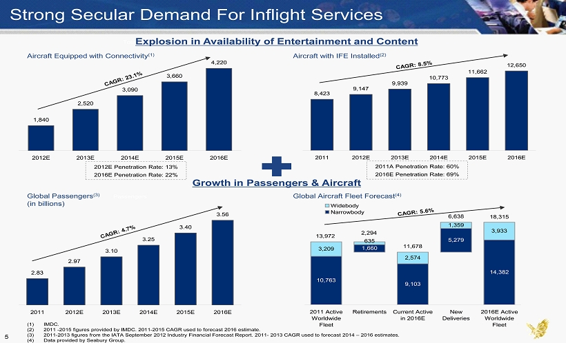 Connectivity Installed on 500+ Planes Expected by Q1 2013 Providing Entertainment to 130+ Airlines Worldwide Global Eagle Entertainment Inc. Only Pure - play Public Company in the IFE Industry Inflight Satellite - based Connectivity IPTV / VOD Wi - Fi Content Delivery Film, TV, Games Customer Digital Interface Paperless Cabin Capital and Media Industry Relationships (Initially Capitalized with $190mm in Cash) An Entertainment - in - Motion Powerhouse is Born Studio Relationships at the Highest Level 4 Global Eagle Acquisition Corp. Global Eagle to Acquire Satellite Connectivity Leader Row 44 and 86% of Leading Inflight Content Provider AIA Create the largest entertainment platform for the underserved 3+ billion airline passenger market poised for significant growth Experienced Media Executives with Public Company Backgrounds M&A Expertise Connectivity + Content + Capital = Unique Growth Platform