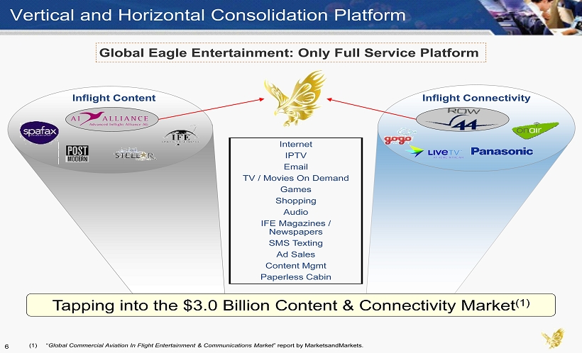 8,423 9,147 9,939 10,773 11,662 12,650 2011 2012E 2013E 2014E 2015E 2016E 10,763 1,660 9,103 5,279 3,209 2,574 1,359 3,933 11,678 6,638 14,382 635 18,315 13,972 2,294 2011 Active Worldwide Fleet Retirements Current Active in 2016E New Deliveries 2016E Active Worldwide Fleet Widebody Narrowbody Passengers 2.83 2.97 3.10 3.25 3.40 3.56 2011 2012E 2013E 2014E 2015E 2016E Total 1,840 2,520 3,090 3,660 4,220 2012E 2013E 2014E 2015E 2016E Global Passengers (3) (in billions) Global Aircraft Fleet Forecast (4) Growth in Passengers & Aircraft Explosion in Availability of Entertainment and Content Aircraft Equipped with Connectivity (1) Aircraft with IFE Installed (2) (1) IMDC. (2) 2011 - 2015 figures provided by IMDC. 2011 - 2015 CAGR used to forecast 2016 estimate. (3) 2011 - 2013 figures from the IATA September 2012 Industry Financial Forecast Report. 2011 - 2013 CAGR used to forecast 2014 – 2016 estimates. (4) Data provided by Seabury Group. 2012E Penetration Rate: 13% 2016E Penetration Rate: 22% 2011A Penetration Rate: 60% 2016E Penetration Rate: 69% Strong Secular Demand For Inflight Services 5
