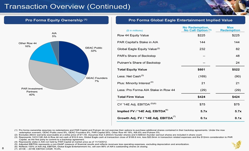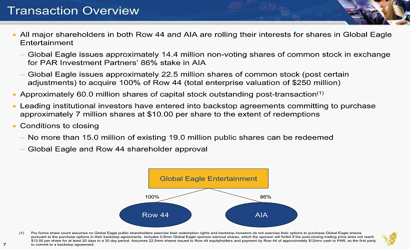 Transaction Overview All major shareholders in both Row 44 and AIA are rolling their interests for shares in Global Eagle Entertainment – Global Eagle issues approximately 14.4 million non - voting shares of common stock in exchange for PAR Investment Partners’ 86% stake in AIA – Global Eagle issues approximately 22.5 million shares of common stock (post certain adjustments) to acquire 100% of Row 44 (total enterprise valuation of $250 million) Approximately 60.0 million shares of capital stock outstanding post - transaction (1) Leading institutional investors have entered into backstop agreements committing to purchase approximately 7 million shares at $10.00 per share to the extent of redemptions Conditions to closing – No more than 15.0 million of existing 19.0 million public shares can be redeemed – Global Eagle and Row 44 shareholder approval (1) Pro forma share count assumes no Global Eagle public shareholders exercise their redemption rights and backstop investors do not exercise their options to purchase Global Eagle shares pursuant to the purchase options in their backstop agreements. Includes 0.9mm Global Eagle sponsor earnout shares, which the spo nsor will forfeit if the post - closing trading price does not reach $13.00 per share for at least 20 days in a 30 day period. Assumes 22.5mm shares issued to Row 44 equityholders and payment by Ro w 44 of approximately $12mm cash to PAR, as the first party to commit to a backstop agreement. Global Eagle Entertainment Row 44 AIA 100% 86% 7