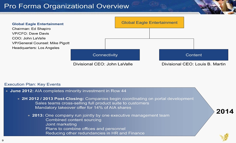 No Redemption, Max No Call Option Redemption Row 44 Equity Value $225 $225 PAR Capital's Stake in AIA 144 144 Global Eagle Equity Value 232 82 PAR's Share of Backstop -- 48 Putnam's Share of Backstop -- 24 Total Equity Value $601 $522 Less: Net Cash (169) (90) Plus: Minority Interest 21 21 Less: Pro Forma AIA Stake in Row 44 (29) (29) Total Firm Value $424 $424 CY '14E Adj. EBITDA $75 $75 Implied FV / '14E Adj. EBITDA 5.7x 5.7x Growth Adj. FV / '14E Adj. EBITDA 0.1x 0.1x Transaction Overview (Continued) Pro Forma Equity Ownership (1) GEAC Public 32% PAR Investment Partners 40% GEAC Founders 7% Other Row 44 16% AIA 5% Pro Forma Global Eagle Entertainment Implied Value (3) (1) Pro forma ownership assumes no redemptions and PAR Capital and Putnam do not exercise their options to purchase addition al shares contained in their backstop agreements. Under the max redemption scenario, GEAC Public owns 8%, GEAC Founders 8%, PAR Capital 55%, Other Row 44 19%, AIA 6% and Putnam 5%. (2) Excludes 26mm warrants exercisable at a strike price of $11.50. Assumes that 3.243mm founder shares and 0.926mm founder ear nout shares are included in share count. (3) Represents 12/31/12E AIA & Row 44 net cash of $10.9 mm, Global Eagle cash at transaction close of $189.8 mm, less $20.9m m i n transaction related expenses and the $12mm consideration to PAR Capital, as the first party to commit to a backstop agreement. (4) Represents stake in AIA not held by PAR Capital at market price as of 11/13/2012. (5) Adjusted EBITDA represents a non - GAAP measure of financial results and reflects revenues less operating expenses, excluding depreciation and amortization. (6) Reflects 100% of AIA Adj. EBITDA; Global Eagle Entertainment Inc. will own 86% of AIA’s outstanding shares at closing. (7) 2013E – 2015E EBITDA CAGR: 70.9%. (2) (6) (4) ($ in millions) (5)(6) 8 (7) (1)