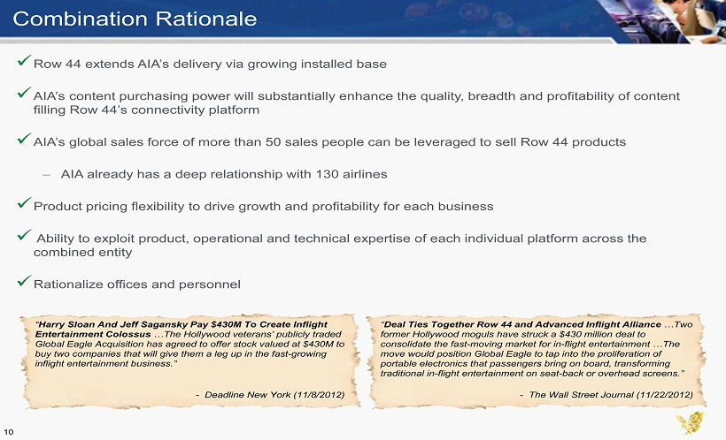 Pro Forma Organizational Overview Global Eagle Entertainment Connectivity Content Divisional CEO: Louis B. Martin Divisional CEO: John LaValle Execution Plan: Key Events 2014 Global Eagle Entertainment Chairman: Ed Shapiro VP/CFO: Dave Davis COO: John LaValle VP/General Counsel: Mike Pigott Headquarters: Los Angeles June 2012: AIA completes minority investment in Row 44 2H 2012 / 2013 Post - Closing: Companies begin coordinating on portal development Sales teams cross - selling full product suite to customers Mandatory takeover offer for 14% of AIA shares 2013: One company run jointly by one executive management team Combined content sourcing Joint marketing Plans to combine offices and personnel Reducing other redundancies in HR and Finance 9