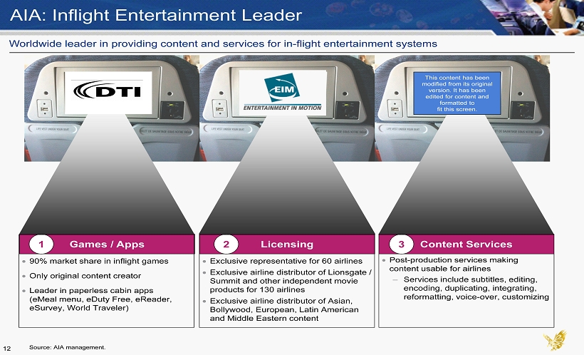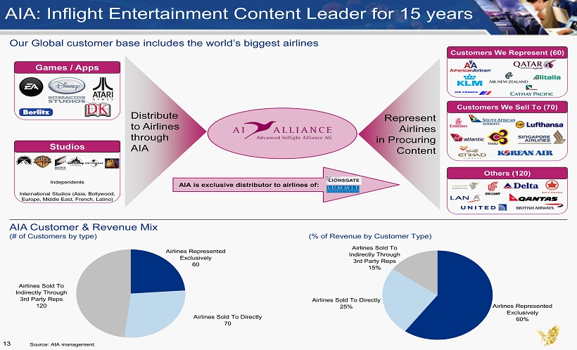 Worldwide leader in providing content and services for in - flight entertainment systems AIA: Inflight Entertainment Leader This content has been modified from its original version. It has been edited for content and formatted to fit this screen. Games / Apps Licensing Content Services 1 2 3 Exclusive representative for 60 airlines Exclusive airline distributor of Lionsgate / Summit and other independent movie products for 130 airlines Exclusive airline distributor of Asian, Bollywood, European, Latin American and Middle Eastern content 90% market share in inflight games Only original content creator Leader in paperless cabin apps (eMeal menu, eDuty Free, eReader, eSurvey, World Traveler) Post - production services making content usable for airlines – Services include subtitles, editing, encoding, duplicating, integrating, reformatting, voice - over, customizing 12 Source: AIA management.