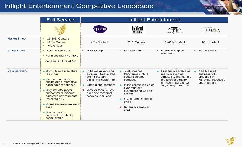 AIA: Inflight Entertainment Content Leader for 15 years Our Global customer base includes the world’s biggest airlines Distribute to Airlines through AIA Studios International Studios (Asia, Bollywood, Europe, Middle East, French, Latino) Independents Customers We Sell To (70) Others (120) Customers We Represent (60) AIA Customer & Revenue Mix (# of Customers by type) (% of Revenue by Customer Type) AIA is exclusive distributor to airlines of: Games / Apps Represent Airlines in Procuring Content 13 Source: AIA management. Airlines Represented Exclusively 60 Airlines Sold To Indirectly Through 3rd Party Reps 120 Airlines Sold To Directly 70 Airlines Represented Exclusively 60% Airlines Sold To Directly 25% Airlines Sold To Indirectly Through 3rd Party Reps 15%