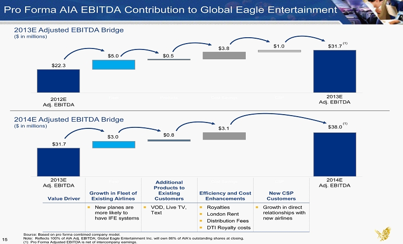 Highly Visible 2014 Adjusted EBITDA Forecast Source: Pro forma combined company model, Industry research. Note: Reflects 100% of AIA Adj. EBITDA; Global Eagle Entertainment Inc. will own 86% of AIA’s outstanding shares at closing. (1) Portal service revenue includes CPM / Advertising revenue, Texting, Sponsorships, Destination Deals, Shopping, and Games / Music. 24 ($ in millions, except IFE Installed Aircraft, Revenue per Airplane and Revenue per Passenger) CONTENT CONNECTIVITY Global Eagle Entertainment Financials Wholesale # of A/C Total Equipment Total Revenue $328 CSP 5,300 $121 2014 Installs 110 Gross Margin 142 Licensing 5,300 51 Revenue per Airplane $187,000 SG&A 39 Games / Apps 3,000 32 Other Overhead 28 Wholesale Revenue $204 Equipment Revenue $21 2014E Adj. EBITDA $75 Gross Margin % 43% Gross Margin % 7% Wholesale Margin $87 Equipment Margin $1.5 Consumer Internet TV / IPTV / VOD Service Internet Average Take Rate 5.75% Blended Revenue per Passenger $0.36 Average Price per Session $5.00 Internet Revenue $47.7 TV / IPTV / VOD Revenue $38 Gross Margin % 9% Portal Service (1) Internet Margin $4.5 Revenue per Passenger $0.15 Portal Revenue $19 Consumer Gross Margin % 87% Consumer Margin $49 Total Content Gross Margin $136 Total Connectivity Gross Margin $6.0 2014 Adjusted EBITDA Build - up $75 million Adjusted EBITDA forecast driven by high margin content sales plus lower margin equipment and Wi - Fi revenue (i.e. “connectivity”) – 132.5 million passengers assumed to have connectivity access in 2014 – Currently signed airlines only – significant upside potential