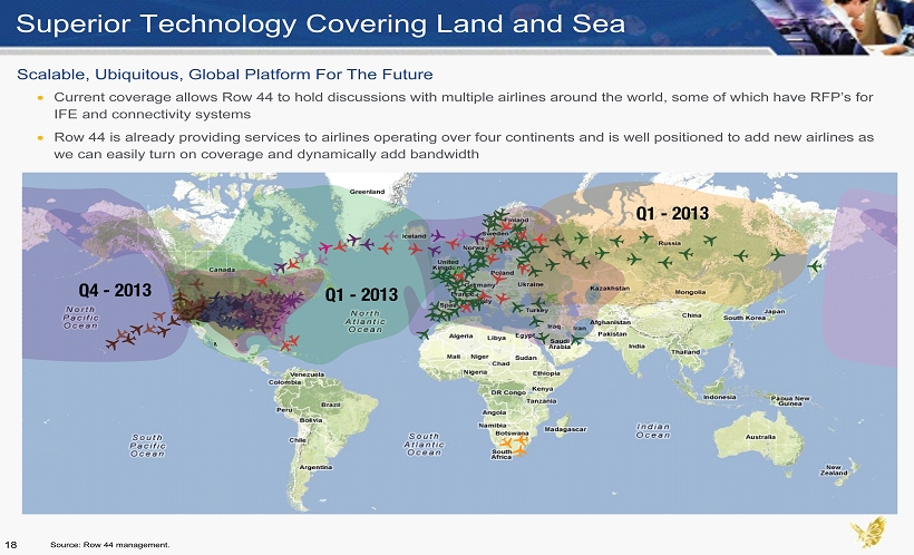Row 44: Inflight Connectivity Leader Current Fleet of Customer Aircraft (~425 Installations) 370 Installations / 541 orders 12 orders (potential additional 16 orders) 48 Installations / 61 orders (potential additional 220 orders) 5 orders (potential additional 23 orders) 7 orders (potential additional 44 orders) Evolution of Company October 2012 UTair signed January 2010 FCC license granted Southwest signed Q2 2012 Launched IPTV trial with SWA Q3 2012 IPTV program with SWA goes fleet wide June 2012 300 th installation March 2012 200 th installation August 2011 100 th installation November 2012 400 th installation May 2012 Transaero Airlines and IcelandAir signed Row 44 Provides Leading Connectivity Technology Leading provider of inflight internet connectivity that can cover both land AND sea Ku - band technology provides high speed broadband internet via a flexible and scalable satellite platform Entertainment portal provides significant revenue streams (Live television, Video on Demand, Text & telephony) Exclusive relationship with Hughes in North America, the largest satellite ISP in the world January 2011 Norwegian Airlines signed Proprietary model for a captive audience Unlimited number of potential customers Technology that can be relevant for decades Idea Generation Social evolution where constant connectivity is a way of life. Investment Thesis 17 Source: Row 44 management.