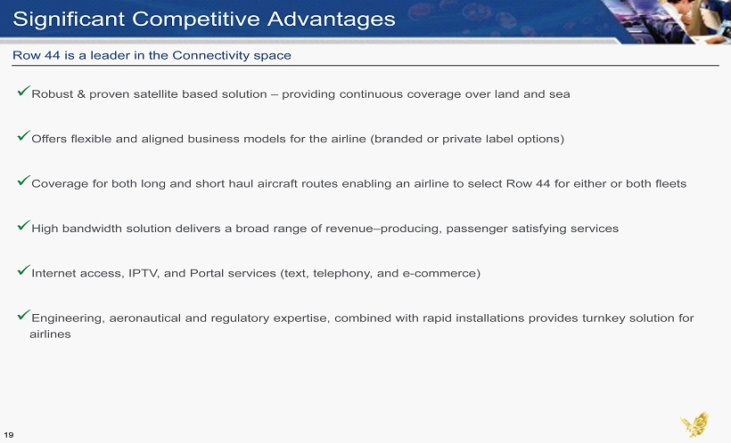 Superior Technology Covering Land and Sea Scalable, Ubiquitous, Global Platform For The Future Source: Row 44 management. Current coverage allows Row 44 to hold discussions with multiple airlines around the world, some of which have RFP’s for IFE and connectivity systems Row 44 is already providing services to airlines operating over four continents and is well positioned to add new airlines as we can easily turn on coverage and dynamically add bandwidth 18