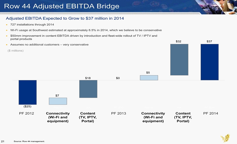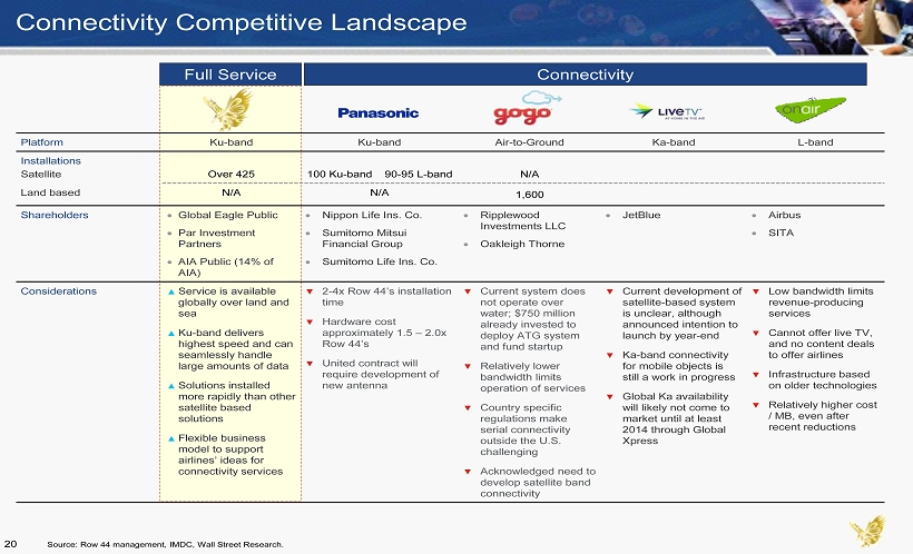 Connectivity Competitive Landscape Platform Ku - band Ku - band Air - to - Ground Ka - band L - band Installations Satellite Over 425 100 Ku - band 90 - 95 L - band N/A Land based N/A N/A 1,600 Shareholders Global Eagle Public Par Investment Partners AIA Public (14% of AIA) Nippon Life Ins. Co. Sumitomo Mitsui Financial Group Sumitomo Life Ins. Co. Ripplewood Investments LLC Oakleigh Thorne JetBlue Airbus SITA Considerations ▲ Service is available globally over land and sea ▲ Ku - band delivers highest speed and can seamlessly handle large amounts of data ▲ Solutions installed more rapidly than other satellite based solutions ▲ Flexible business model to support airlines’ ideas for connectivity services ▼ 2 - 4x Row 44’s installation time ▼ Hardware cost approximately 1.5 – 2.0x Row 44’s ▼ United contract will require development of new antenna ▼ Current system does not operate over water; $750 million already invested to deploy ATG system and fund startup ▼ Relatively lower bandwidth limits operation of services ▼ Country specific regulations make serial connectivity outside the U.S. challenging ▼ Acknowledged need to develop satellite band connectivity ▼ Current development of satellite - based system is unclear, although announced intention to launch by year - end ▼ Ka - band connectivity for mobile objects is still a work in progress ▼ Global Ka availability will likely not come to market until at least 2014 through Global Xpress ▼ Low bandwidth limits revenue - producing services ▼ Cannot offer live TV, and no content deals to offer airlines ▼ Infrastructure based on older technologies ▼ Relatively higher cost / MB, even after recent reductions Source: Row 44 management, IMDC, Wall Street Research. Connectivity Full Service 20
