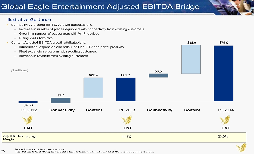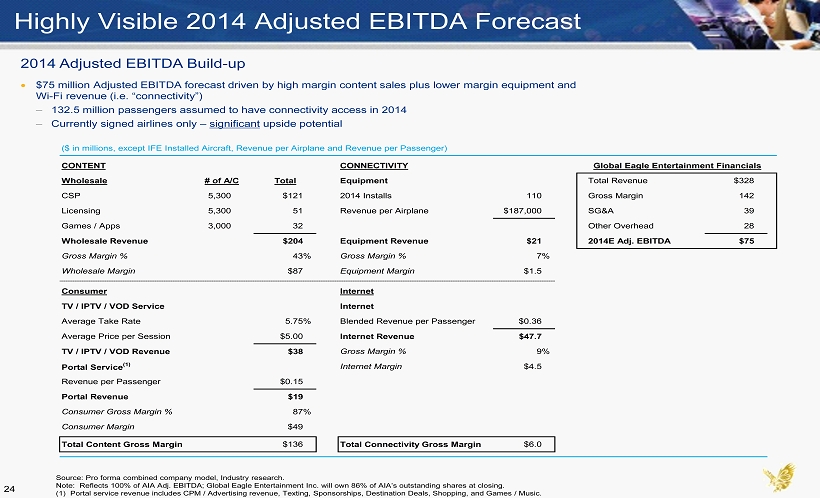 Illustrative Guidance Connectivity Adjusted EBITDA growth attributable to: – Increase in number of planes equipped with connectivity from existing customers – Growth in number of passengers with Wi - Fi devices – Rising Wi - Fi take rate Content Adjusted EBITDA growth attributable to: – Introduction, expansion and rollout of TV / IPTV and portal products – Fleet expansion programs with existing customers – Increase in revenue from existing customers $31.7 ($2.7) $75.0 $7.0 $5.0 $38.9 $27.4 PF 2012 Connect Content PF 2013 Connect Content PF 2014 ` Adj. EBITDA Margin Global Eagle Entertainment Adjusted EBITDA Bridge ($ millions) ENT ENT ENT PF 2013 PF 2014 (1.1%) 11.7% 23.0% Connectivity Content Connectivity Content PF 2012 23 Source: Pro forma combined company model. Note: Reflects 100% of AIA Adj. EBITDA; Global Eagle Entertainment Inc. will own 86% of AIA’s outstanding shares at closing.