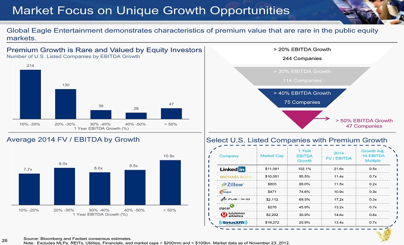 Market Focus on Unique Growth Opportunities > 20% EBITDA Growth 244 Companies > 30% EBITDA Growth 114 Companies > 40% EBITDA Growth 75 Companies Premium Growth is Rare and Valued by Equity Investors Number of U.S. Listed Companies by EBITDA Growth Average 2014 FV / EBITDA by Growth 214 130 39 28 47 10% -20% 20% -30% 30% -40% 40% -50% > 50% 1 Year EBITDA Growth (%) 7.7x 9.0x 8.0x 8.5x 10.9x 10% -20% 20% -30% 30% -40% 40% -50% > 50% 1 Year EBITDA Growth (%) Source: Bloomberg and Factset consensus estimates. Note: Excludes MLPs, REITs, Utilities, Financials, and market caps < $200mm and > $100bn. Market data as of November 23, 201 2. Company Market Cap 1 Year EBITDA Growth 2014 FV / EBITDA Growth Adj. ’14 EBITDA Multiple $11,081 102.1% 21.6x 0.5x $10,051 95.5% 11.4x 0.7x $803 88.0% 11.5x 0.2x $471 74.6% 10.9x 0.3x $2,112 69.5% 17.2x 0.3x $278 45.8% 13.2x 0.7x $2,202 30.9% 14.6x 0.6x $19,272 20.9% 13.4x 0.7x Select U.S. Listed Companies with Premium Growth > 50% EBITDA Growth 47 Companies Global Eagle Entertainment demonstrates characteristics of premium value that are rare in the public equity markets. 26