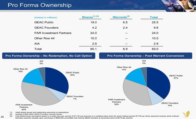 Pro Forma Ownership GEAC Public 32% PAR Investment Partners 40% GEAC Founders 7% Other Row 44 16% AIA 5% Pro Forma Ownership – No Redemption, No Call Option Pro Forma Ownership – Post Warrant Conversion (shares in millions) Shares (1) (2) Warrants (3) Total GEAC Public 19.0 6.5 25.5 GEAC Founders 4.2 2.4 6.6 PAR Investment Partners 24.0 -- 24.0 Other Row 44 10.0 -- 10.0 AIA 2.9 -- 2.9 Total 60.1 8.9 69.0 GEAC Public 37% AIA 5% Other Row 44 14% GEAC Founders 10% PAR Investment Partners 35% (1) Initial shares issued and outstanding assuming no redemptions. (2) Includes 0.926 million GEAC Founders’ earnout shares. (3) Fully - diluted share equivalents based on a strike price per warrant of $11.50 and exercise on a cashless basis when the stock tr ading reaches $17.50 per share (assumes treasury stock method). Excludes warrants issuable upon conversion of $500,000 convertible note held by GEAC founders at conversion price of $0.75 pe r w arrant. 29