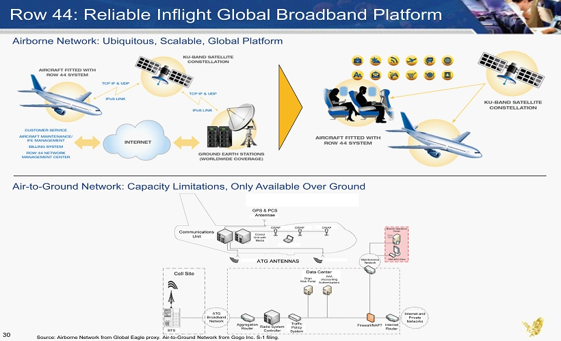 Row 44: Reliable Inflight Global Broadband Platform Airborne Network: Ubiquitous, Scalable, Global Platform Air - to - Ground Network: Capacity Limitations, Only Available Over Ground Source: Airborne Network from Global Eagle proxy. Air - to - Ground Network from Gogo Inc. S - 1 filing. ATG ANTENNAS CWAP CWAP CWAP GPS & PCS Antennae Consol Unit with Media Communications Unit ATG Broadband Network Cell Site Data Center Gogo Web Portal AAA (Accounting Authentication) Aggregation Router Radio System Controller Traffic Policy System Firewall/NAPT Internet Router Internet and Private Networks BTS Maintenance Network Network Operations Center DNS - NAS Client 30