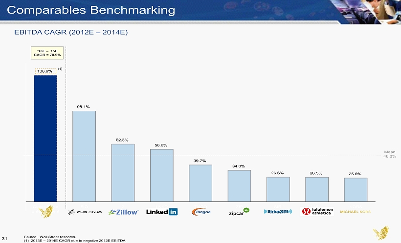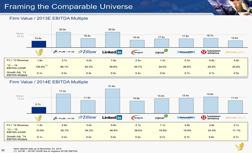 136.6% 98.1% 62.3% 56.6% 39.7% 34.0% 26.6% 26.5% 25.6% Global Eagle Entertainment FIO Z LNKD TNGO ZIP SIRI LULU KORS EBITDA CAGR (2012E – 2014E) Source: Wall Street research. (1) 2013E – 2014E CAGR due to negative 2012E EBITDA. Mean 46.2% ’13E – ’15E CAGR = 70.9% Comparables Benchmarking (1) Comparables Benchmarking 31