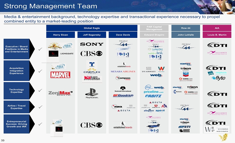 Strong Management Team Media & entertainment background, technology expertise and transactional experience necessary to propel combined entity to a market - leading position PAR Capital Management Row 44 AIA Global Eagle Executive / Board Positions in Media and Entertainment Acquisition Integration Experience Technology Expertise Entrepreneurial Success: Driving Growth and IRR P P P P Jeff Sagansky Harry Sloan Airline / Travel Expertise Edward Shapiro John LaValle P Louis B . Martin 33 Dave Davis