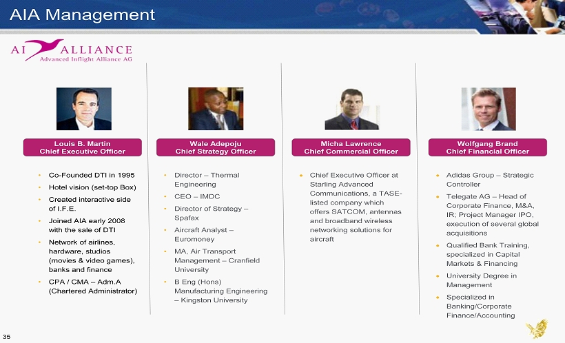 AIA Management • Co - Founded DTI in 1995 • Hotel vision (set - top Box) • Created interactive side of I.F.E. • Joined AIA early 2008 with the sale of DTI • Network of airlines, hardware, studios (movies & video games), banks and finance • CPA / CMA – Adm.A (Chartered Administrator) • Director – Thermal Engineering • CEO – IMDC • Director of Strategy – Spafax • Aircraft Analyst – Euromoney • MA, Air Transport Management – Cranfield University • B Eng (Hons) Manufacturing Engineering – Kingston University Chief Executive Officer at Starling Advanced Communications, a TASE - listed company which offers SATCOM, antennas and broadband wireless networking solutions for aircraft Adidas Group – Strategic Controller Telegate AG – Head of Corporate Finance, M&A, IR; Project Manager IPO, execution of several global acquisitions Qualified Bank Training, specialized in Capital Markets & Financing University Degree in Management Specialized in Banking/Corporate Finance/Accounting Louis B. Martin Chief Executive Officer Wale Adepoju Chief Strategy Officer Micha Lawrence Chief Commercial Officer Wolfgang Brand Chief Financial Officer 35