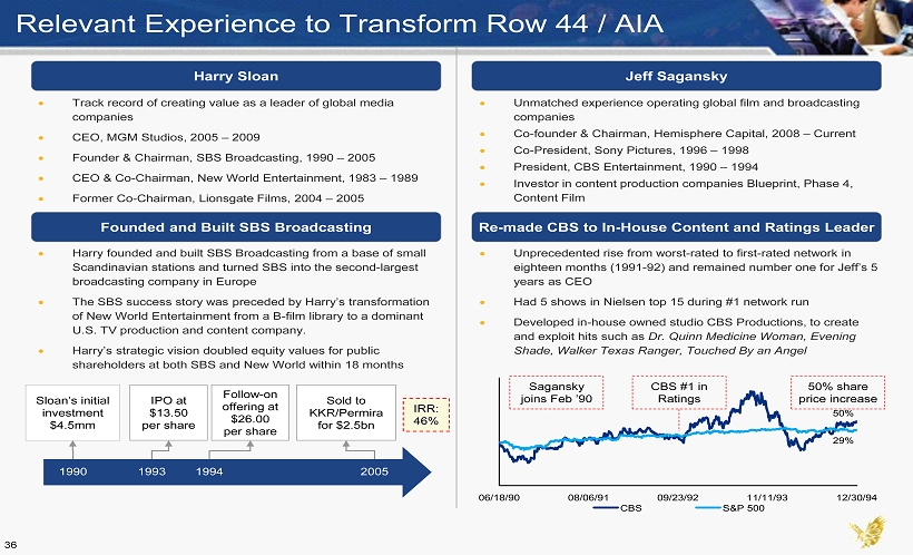 Jeff Sagansky Harry Sloan Harry founded and built SBS Broadcasting from a base of small Scandinavian stations and turned SBS into the second - largest broadcasting company in Europe The SBS success story was preceded by Harry’s transformation of New World Entertainment from a B - film library to a dominant U.S. TV production and content company. Harry’s strategic vision doubled equity values for public shareholders at both SBS and New World within 18 months Unprecedented rise from worst - rated to first - rated network in eighteen months (1991 - 92) and remained number one for Jeff’s 5 years as CEO Had 5 shows in Nielsen top 15 during #1 network run Developed in - house owned studio CBS Productions, to create and exploit hits such as Dr. Quinn Medicine Woman, Evening Shade, Walker Texas Ranger, Touched By an Angel Founded and Built SBS Broadcasting IPO at $13.50 per share Follow - on offering at $26.00 per share Sold to KKR/Permira for $2.5bn Sloan’s initial investment $4.5mm 1990 2005 1993 IRR: 46% 1994 Track record of creating value as a leader of global media companies CEO, MGM Studios, 2005 – 2009 Founder & Chairman, SBS Broadcasting, 1990 – 2005 CEO & Co - Chairman, New World Entertainment, 1983 – 1989 Former Co - Chairman, Lionsgate Films, 2004 – 2005 Unmatched experience operating global film and broadcasting companies Co - founder & Chairman, Hemisphere Capital, 2008 – Current Co - President, Sony Pictures, 1996 – 1998 President, CBS Entertainment, 1990 – 1994 Investor in content production companies Blueprint, Phase 4, Content Film Re - made CBS to In - House Content and Ratings Leader 50% 29% 06/18/90 08/06/91 09/23/92 11/11/93 12/30/94 CBS S&P 500 CBS #1 in Ratings Sagansky joins Feb ’90 50% share price increase Relevant Experience to Transform Row 44 / AIA 36