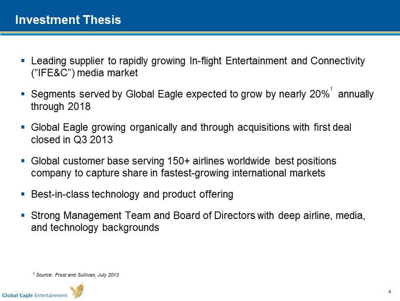 4 Investment Thesis ▪ Leading supplier to rapidly growing In - flight Entertainment and Connectivity (“IFE&C”) media market ▪ Segments served by Global Eagle expected to grow by nearly 20% 1 annually through 2018 ▪ Global Eagle growing organically and through acquisitions with first deal closed in Q3 2013 ▪ Global customer base serving 150+ airlines worldwide best positions company to capture share in fastest - growing international markets ▪ Best - in - class technology and product offering ▪ Strong Management Team and Board of Directors with deep airline, media, and technology backgrounds 1 Source: Frost and Sullivan, July 2013