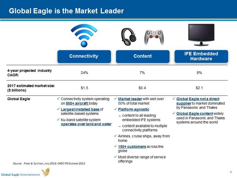 6 Global Eagle Provides Content and Connectivity Solutions to IFE&C Market Connectivity Content ▪ Movies, TV, audio programming – Hollywood and worldwide ▪ Original and licensed games and applications ▪ Technical and content integration services ▪ Software development (GUI, web - based applications, others) ▪ Platform agnostic – connected or embedded systems ▪ Satellite - based Internet connectivity ▪ Live TV programming ▪ Video on - demand programming ▪ Online portal services – shopping, destination deals, texting ▪ Streaming WiFi VoD delivery system