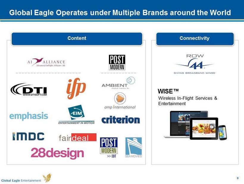 8 Global Eagle Operates under Multiple Brands around the World Connectivity Content Wireless In - Flight Services & Entertainment WISE™