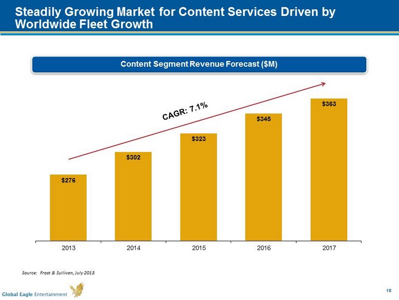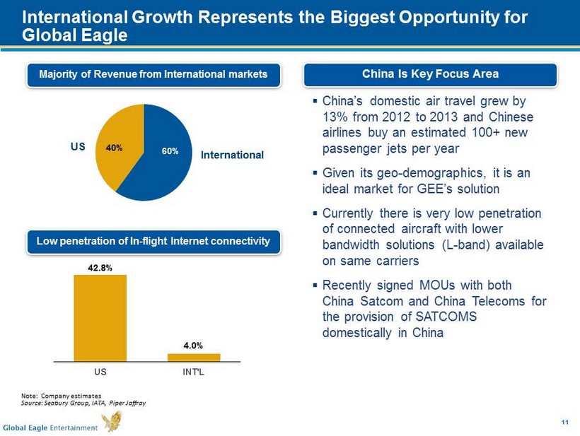 10 In - flight Entertainment Market Expected to Grow Rapidly Source: Frost & Sullivan, July 2013 Global Eagle Is a Leader in Content and Connectivity Segment $ 1.4 $ 1.5 $ 1.6 $ 1.8 $ 1.9 $ 2.1 $0.3 $0.3 $0.4 $0.4 $0.4 $0.4 $0.4 $0.6 $0.8 $ 1.0 $ 1.3 $ 1.7 $ 2.1 $ 2.4 $ 2.8 $ 3.2 $ 3.6 $ 4.0 2012 2013E 2014E 2015E 2016E 2017E Hardware Content Connectivity Worldwide IFE market ($ billions) Global Eagle addressable market >$2.0B