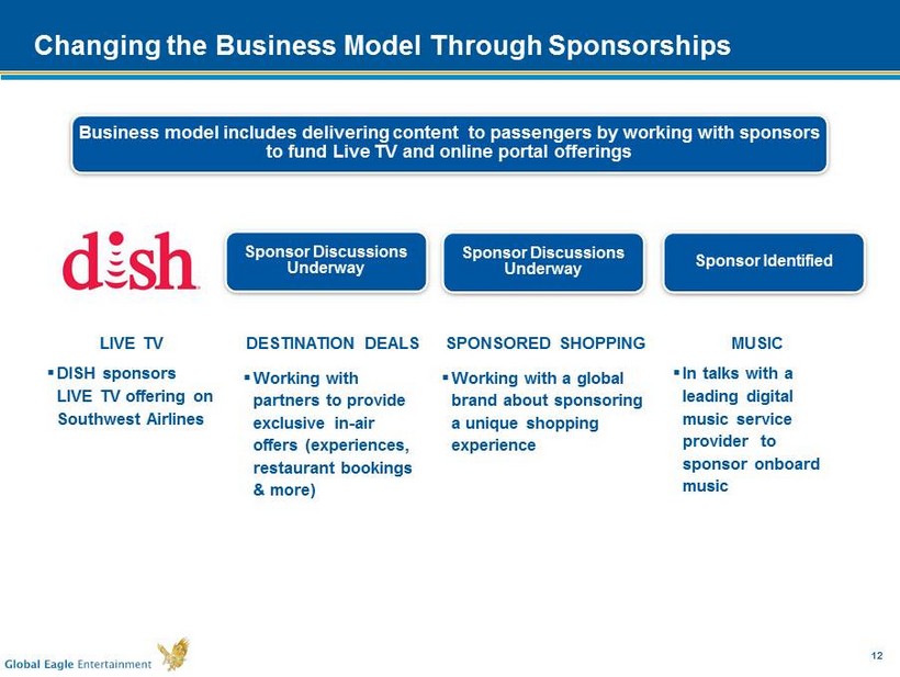 11 International Growth Represents the Biggest Opportunity for Global Eagle China Is Key Focus Area Note: Company estimates Source: Seabury Group, IATA, Piper Jaffray Majority of Revenue from International markets Low penetration of In - flight Internet connectivity 42.8% 4.0% US INT'L 60% 40% International US ▪ China’s domestic air travel grew by 13% from 2012 to 2013 and Chinese airlines buy an estimated 100+ new passenger jets per year ▪ Given its geo - demographics, it is an ideal market for GEE’s solution ▪ Currently there is very low penetration of connected aircraft with lower bandwidth solutions (L - band) available on same carriers ▪ Recently signed MOUs with both China Satcom and China Telecoms for the provision of SATCOMS domestically in China
