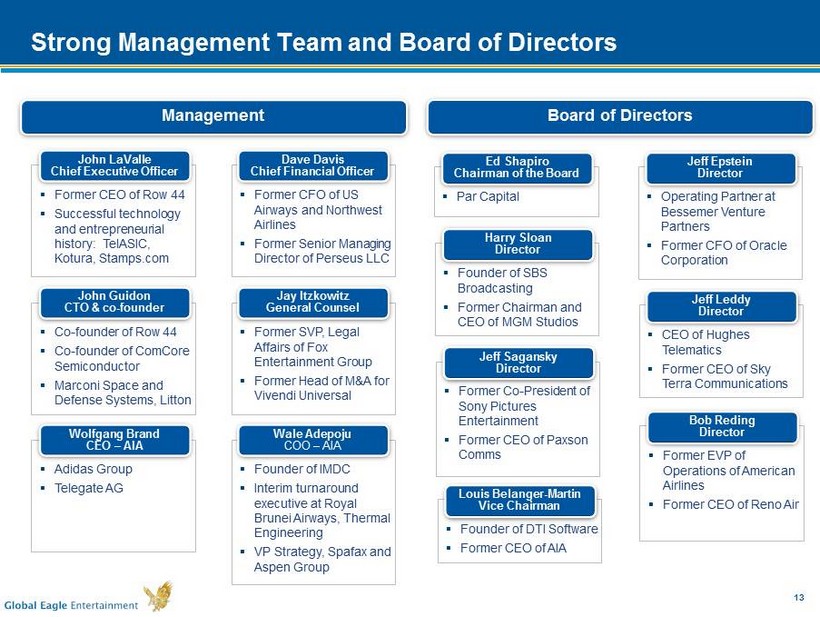 12 LIVE TV ▪ DISH sponsors LIVE TV offering on Southwest Airlines DESTINATION DEALS ▪ Working with partners to provide exclusive in - air offers (experiences, restaurant bookings & more) SPONSORED SHOPPING ▪ Working with a global brand about sponsoring a unique shopping experience MUSIC ▪ In talks with a leading digital music service provider to sponsor onboard music Changing the Business Model Through Sponsorships Business model includes delivering content to passengers by working with sponsors to fund Live TV and online portal offerings Sponsor Discussions Underway Sponsor Discussions Underway Sponsor Identified