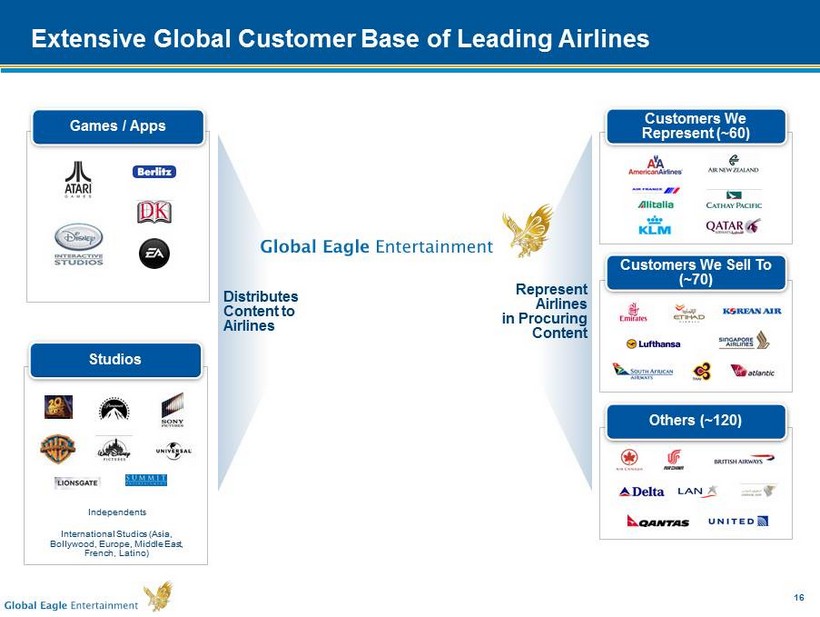 15 ▪ Post - production services making content usable for airlines ▪ Services include subtitles, editing, encoding, duplicating, integrating, reformatting, voice - over, customizing ▪ Video and audio content from worldwide sources delivered in 47 languages on 12 different IFE platforms ▪ Exclusive representative for 60 airlines ▪ Exclusive airline distributor of Lionsgate / Summit and other independent movie products for 100 airlines ▪ Distributor of Asian, Bollywood, European and Middle Eastern content to airlines ▪ Licensing of over 24 Chinese movies and 50 Hollywood titles a year ▪ Largest market share in in - flight gaming content (180 game titles) ▪ Original content creator ▪ Wise software platform offers streaming WiFi VoD / AoD on multiple platforms ▪ Leader in paperless cabin ( eMeal menu, eDuty Free, eReader , eSurvey , World Traveler) Global Eagle Offers the Most Diverse Content Offering Original Apps & Games Licensing Content Services
