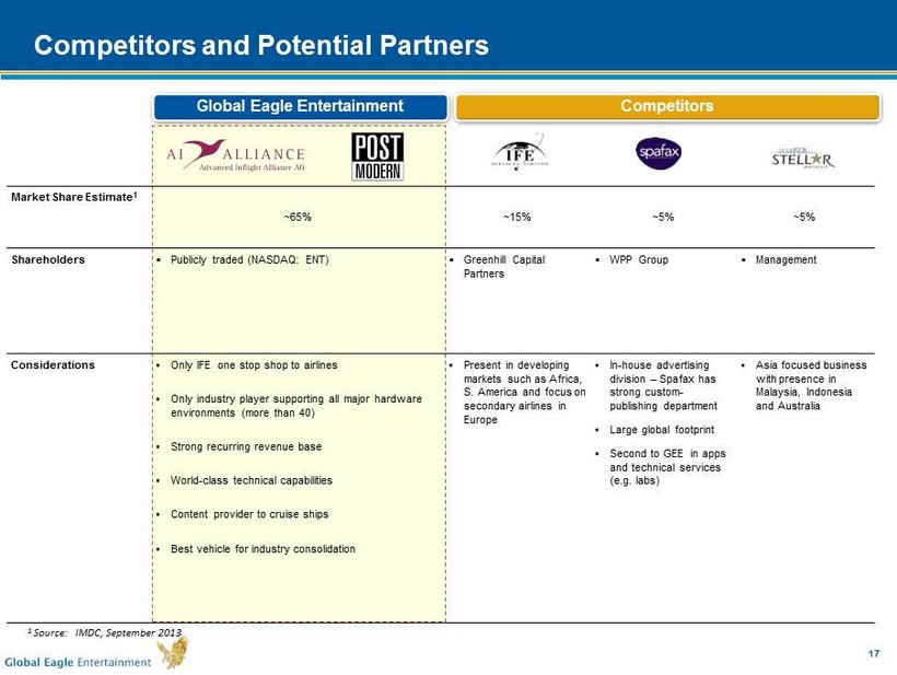 16 Extensive Global Customer Base of Leading Airlines Studios International Studios (Asia, Bollywood , Europe, Middle East, French, Latino) Independents Customers We Sell To (~70 ) Others (~120 ) Customers We Represent (~60 ) Games / Apps Represent Airlines in Procuring Content Distributes Content to Airlines
