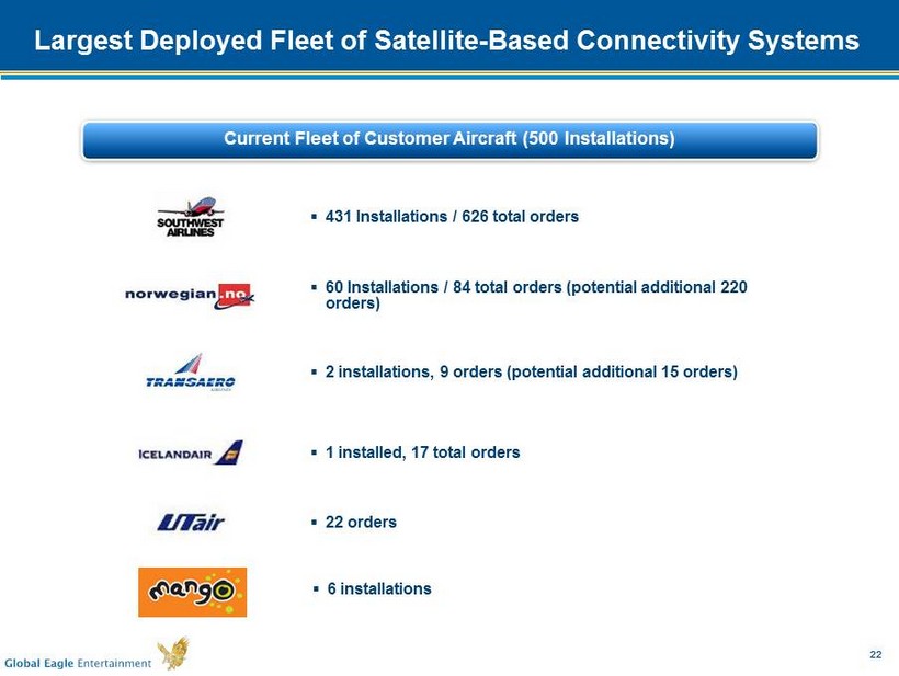 7 Global Eagle is the Market Leader Connectivity Content IFE Embedded Hardware 4 - year projected industry CAGR : 24% 7% 8% 2017 estimated market size: ($ billions) $1.5 $0.4 $2.1 Global Eagle x Connectivity system operating on 500+ aircraft today x Largest installed base of satellite - based systems x Ku - band satellite system operates over land and water x Market leader with well over 50% of total market x Platform agnostic ̶ content to all leading embedded IFE systems ̶ content available to multiple connectivity platforms x Airlines, cruise ships, away from home x 150+ customers across the globe x Most diverse range of service offerings x Global Eagle not a direct supplier to market dominated by Panasonic and Thales x Global Eagle content widely used in Panasonic and Thales systems around the world Source: Frost & Sullivan, July 2013; IMDC IFE Outlook 2012