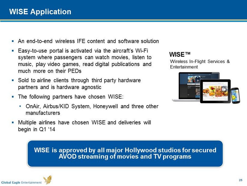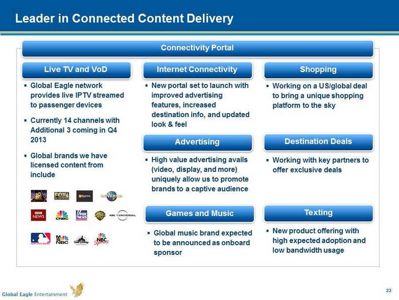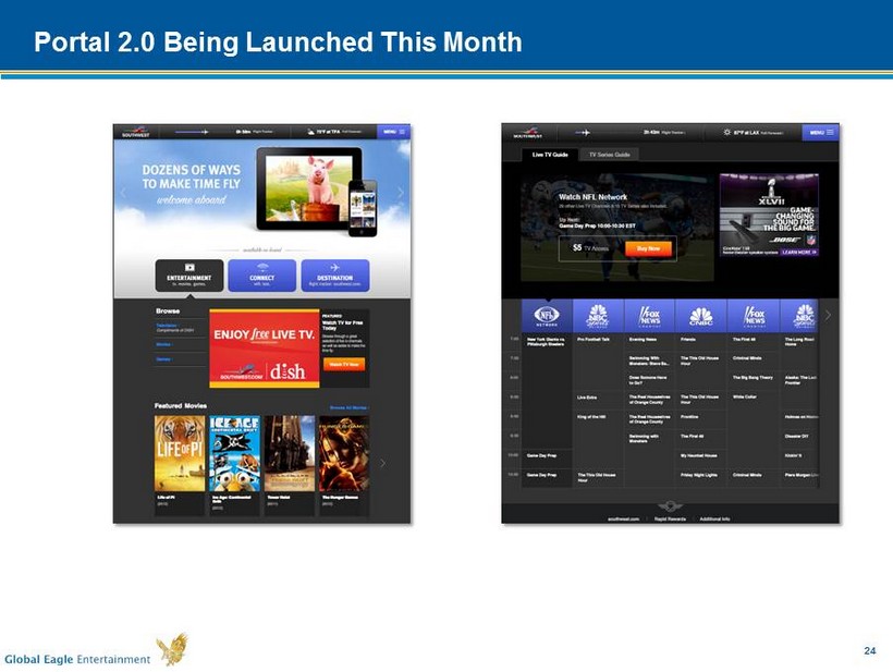 23 Leader in Connected Content Delivery Connectivity Portal Live TV and VoD Internet Connectivity Shopping Advertising Destination Deals Texting Games and Music ▪ Global Eagle network provides live IPTV streamed to passenger devices ▪ Currently 14 channels with Additional 3 coming in Q4 2013 ▪ Global brands we have licensed content from include ▪ New portal set to launch with improved advertising features, increased destination info, and updated look & feel ▪ High value advertising avails (video, display, and more) uniquely allow us to promote brands to a captive audience ▪ Working on a US/global deal to bring a unique shopping platform to the sky ▪ Working with key partners to offer exclusive deals ▪ New product offering with high expected adoption and low bandwidth usage ▪ Global music brand expected to be announced as onboard sponsor
