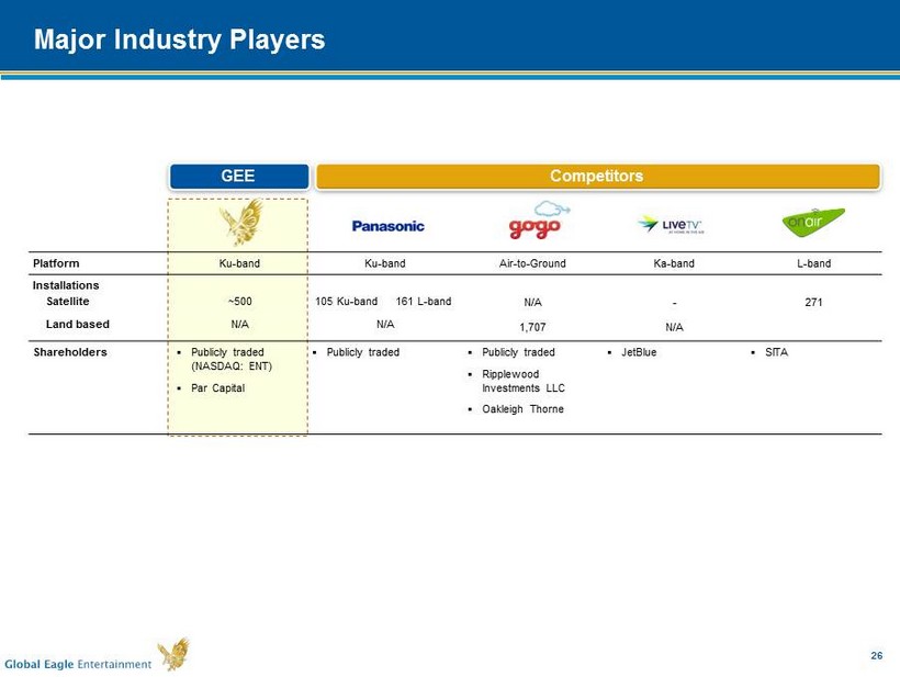 26 Major Industry Players Platform Ku - band Ku - band Air - to - Ground Ka - band L - band Installations Satellite ~500 105 Ku - band 161 L - band N/A - 271 Land based N/A N/A 1,707 N/A Shareholders ▪ Publicly traded (NASDAQ: ENT ) ▪ Par Capital ▪ Publicly traded ▪ Publicly traded ▪ Ripplewood Investments LLC ▪ Oakleigh Thorne ▪ JetBlue ▪ SITA Competitors GEE
