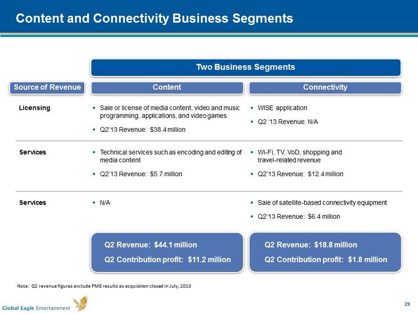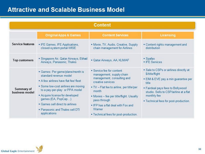 29 Source of Revenue Content and Connectivity Business Segments Connectivity Content Note: Q2 revenue figures exclude PMG results as acquisition closed in July, 2013 Two Business Segments Q2 Revenue: $44.1 million Q2 Contribution profit: $11.2 million Licensing ▪ Sale or license of media content, video and music programming, applications, and video games ▪ Q2’13 Revenue: $38.4 million ▪ WISE application ▪ Q2 ‘13 Revenue: N/A Services ▪ Technical services such as encoding and editing of media content ▪ Q2’13 Revenue: $5.7 million ▪ Wi - Fi, TV, VoD, shopping and travel - related revenue ▪ Q2’13 Revenue: $12.4 million Services ▪ N/A ▪ Sale of satellite - based connectivity equipment ▪ Q2’13 Revenue: $6.4 million Q2 Revenue: $18.8 million Q2 Contribution profit: $1.8 million
