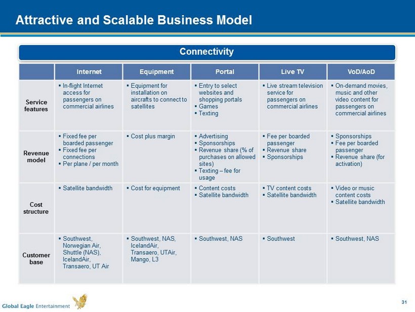 30 Attractive and Scalable Business Model Original Apps & Games Content Services Licensing Service features ▪ IFE Games, IFE Applications, closed - system portal - WISE ▪ Movie, TV, Audio, Creative, Supply chain management for Airlines ▪ Content rights management and distribution Top customers ▪ Singapore Air, Qatar Airways, Etihad Airways, Panasonic, Thales ▪ Qatar Airways, AA, KLM/AF ▪ Spafax ▪ IFE Services Summary of business model ▪ Games: Per game/plane/month is standard revenue model ▪ A few airlines have flat fee / fleet ▪ Some low - cost airlines are moving to a pay - per - play or PPA model ▪ Acquire license for developed games (EA, PopCap …) ▪ Games s ell direct to airlines ▪ Panasonic and Thales sell DTI applications ▪ Service fee for content management, supply chain management, consulting and creative services ▪ TV – Flat fee to airline, per title/per month ▪ Movies – fee per title/flight. Usually pass through ▪ IFP has a flat deal with Fox and Warner ▪ Technical fees for post - production. ▪ Sale to CSPs or airlines directly at $/title/flight ▪ EIM & EVE pay a min guarantee per title ▪ Fairdeal pays fees to Bollywood studio. Sells to CSP/airline at a flat monthly fee ▪ Technical fees for post - production. Content
