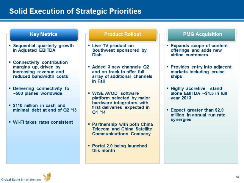 32 ▪ Sequential quarterly growth in Adjusted EBITDA ▪ Connectivity contribution margins up, driven by increasing revenue and reduced bandwidth costs ▪ Delivering connectivity to ~500 planes worldwide ▪ $110 million in cash and minimal debt at end of Q2 ‘13 ▪ Wi - Fi takes rates consistent Key Metrics Product Rollout PMG Acquisition ▪ Live TV product on Southwest sponsored by Dish ▪ Added 3 new channels Q2 and on track to offer full array of additional channels in Fall ▪ WISE AVOD software platform selected by major hardware integrators with first deliveries expected in Q1 ‘14 ▪ Partnership with both China Telecom and China Satellite Communications Company ▪ Portal 2.0 being launched this month ▪ E xpands scope of content offerings and adds new airline customers ▪ Provides entry into adjacent markets including cruise ships ▪ Highly accretive - stand - alone EBITDA ~$4.5 in full year 2013 ▪ Expect greater than $2.0 million in annual run rate synergies Solid Execution of Strategic Priorities