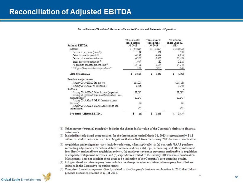 36 Reconciliation of Adjusted EBITDA Reconciliations of Non-GAAP Measures to Unaudited Consolidated Statements of Operations Adjusted EBITDA: Three months ended March 31, 2013 Three months ended June 30, 2013 Six months ended June 30, 2013 Net loss $ (27,021) $ (13,029) $ (40,050) Income tax expense/(benefit) 34 559 593 Other income (expense) (1) 4,835 4,994 9,829 Depreciation and amortization 4,702 6,977 11,679 Stock-based compensation (2) 1,647 880 2,528 Acquisition and realignment costs (3) 12,752 1,594 14,346 F/X gain (loss) on intercompany loan (4) 1,378 (533) 845 Adjusted EBITDA $ (1,673) $ 1,443 $ (230) Pro-forma Adjustments January 2013 GEAC Pre-tax loss (22,100) (22,116) January 2013 AIA Pre-tax income 1,306 1,306 Add back: - January 2013 GEAC Other income (expense) 11,697 11,697 January 2013 GEAC Business Combination Fees and Expenses (5) 10,243 10,243 January 2013 AIA & GEAC Interest expense (income) 66 66 January 2013 AIA & GEAC Depreciation and amortization 471 471 Pro-forma Adjusted EBITDA $ (6) $ 1,443 $ 1,437