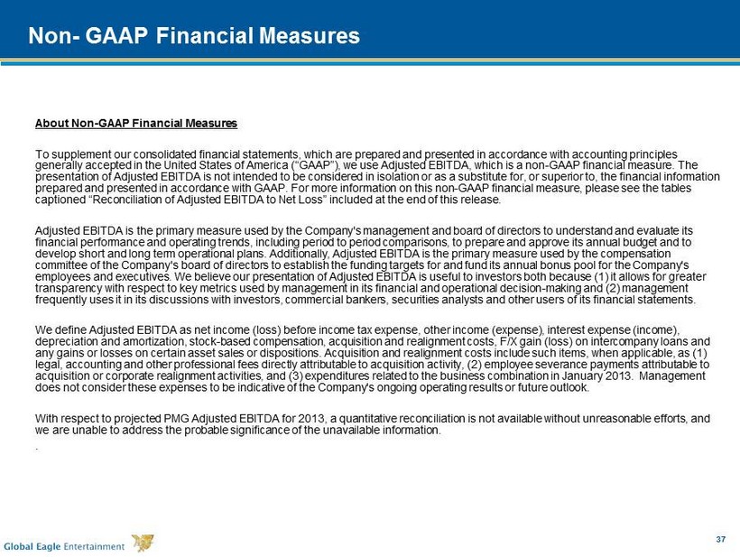 37 Non - GAAP Financial Measures About Non - GAAP Financial Measures To supplement our consolidated financial statements, which are prepared and presented in accordance with accounting principle s generally accepted in the United States of America (“ GAAP ”), we use Adjusted EBITDA, which is a non - GAAP financial measure. The presentation of Adjusted EBITDA is not intended to be considered in isolation or as a substitute for, or superior to, the fin anc ial information prepared and presented in accordance with GAAP . For more information on this non - GAAP financial measure, please see the tables captioned “Reconciliation of Adjusted EBITDA to Net Loss” included at the end of this release. Adjusted EBITDA is the primary measure used by the Company's management and board of directors to understand and evaluate its financial performance and operating trends, including period to period comparisons, to prepare and approve its annual budget and to develop short and long term operational plans. Additionally, Adjusted EBITDA is the primary measure used by the compensation committee of the Company's board of directors to establish the funding targets for and fund its annual bonus pool for the Com pan y's employees and executives. We believe our presentation of Adjusted EBITDA is useful to investors both because (1) it allows fo r g reater transparency with respect to key metrics used by management in its financial and operational decision - making and (2) management frequently uses it in its discussions with investors, commercial bankers, securities analysts and other users of its financia l s tatements. We define Adjusted EBITDA as net income (loss) before income tax expense, other income (expense), interest expense (income), depreciation and amortization, stock - based compensation, acquisition and realignment costs, F/X gain (loss) on intercompany loan s and any gains or losses on certain asset sales or dispositions. Acquisition and realignment costs include such items, when applic abl e, as (1) legal, accounting and other professional fees directly attributable to acquisition activity, (2) employee severance payments att ributable to acquisition or corporate realignment activities, and (3) expenditures related to the business combination in January 2013. M ana gement does not consider these expenses to be indicative of the Company's ongoing operating results or future outlook. With respect to projected PMG Adjusted EBITDA for 2013, a quantitative reconciliation is not available without unreasonable e ffo rts, and we are unable to address the probable significance of the unavailable information. .