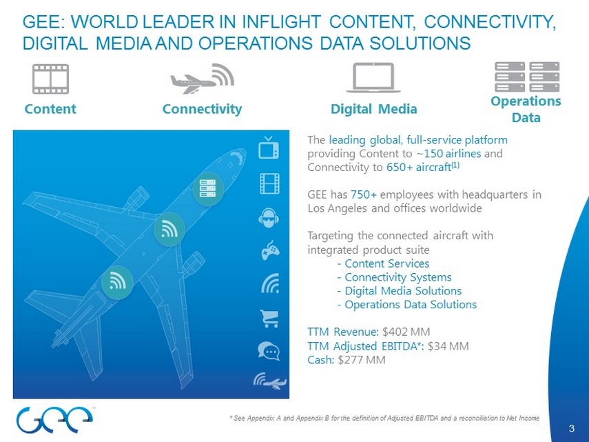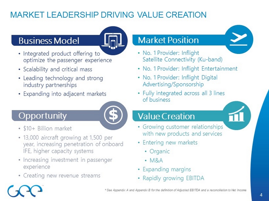 The leading global, full - service platform providing Content to ~ 150 airlines and Connectivity to 650+ aircraft (1) GEE has 750+ employees with headquarters in Los Angeles and offices worldwide Targeting the connected aircraft with integrated product suite - Content Services - Connectivity Systems - Digital Media Solutions - Operations Data Solutions TTM Revenue : $402 MM TTM Adjusted EBITDA*: $34 MM Cash: $277 MM GEE: WORLD LEADER IN INFLIGHT CONTENT, CONNECTIVITY, DIGITAL MEDIA AND OPERATIONS DATA SOLUTIONS 3 Content Connectivity Digital Media Operations Data * See Appendix A and Appendix B for the definition of Adjusted EBITDA and a reconciliation to Net Income