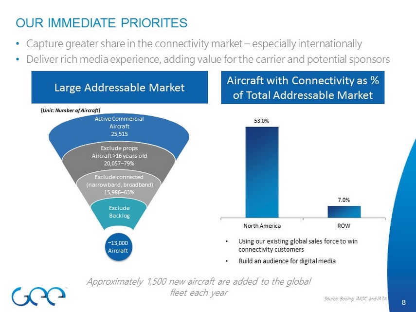 Large Addressable Market Source: Boeing, IMDC and IATA Active Commercial Aircraft 25,515 Exclude props Aircraft >16 years old 20,057 – 79% Exclude connected (narrowband, broadband) 15,986 – 63% Exclude Backlog Aircraft with Connectivity as % of Total Addressable Market Connectivity Market: Huge Revenue Opportunity ( Unit: Number of Aircraft ) OUR IMMEDIATE PRIORITES 8 ~13,000 Aircraft 53.0% 7.0% North America ROW Approximately 1,500 new aircraft are added to the global fleet each year • Using our existing global sales force to win connectivity customers • Build an audience for digital media • Capture greater share in the connectivity market – especially internationally • Deliver rich media experience, adding value for the carrier and potential sponsors
