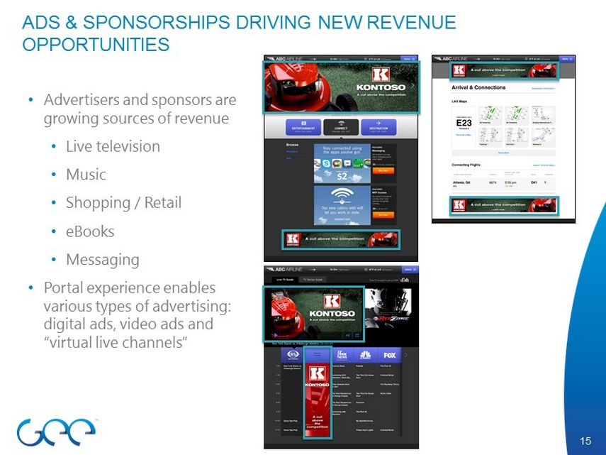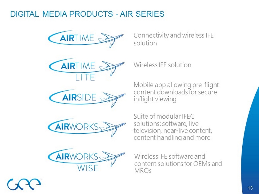 12 DIGITAL MEDIA SOLUTIONS – CURRENT , CURATED, CUSTOMIZED PARTNERSHIPS • GEE connects airlines and advertisers in a meaningful way to drive brand value, product awareness, create engaging compelling user scenarios, new business models and revenue streams PERSONAL EXPERIENCES • The proliferation of BYOD enables delivery of timely, curated, content and personalized experiences that inform the passenger journey from the cabin and beyond the terminal DIGITAL MEDIA SOLUTIONS • GEE integrates content and connectivity to deliver rich, dynamic digital media solutions including IPTV, streaming music, ecommerce, advertising and sponsorships