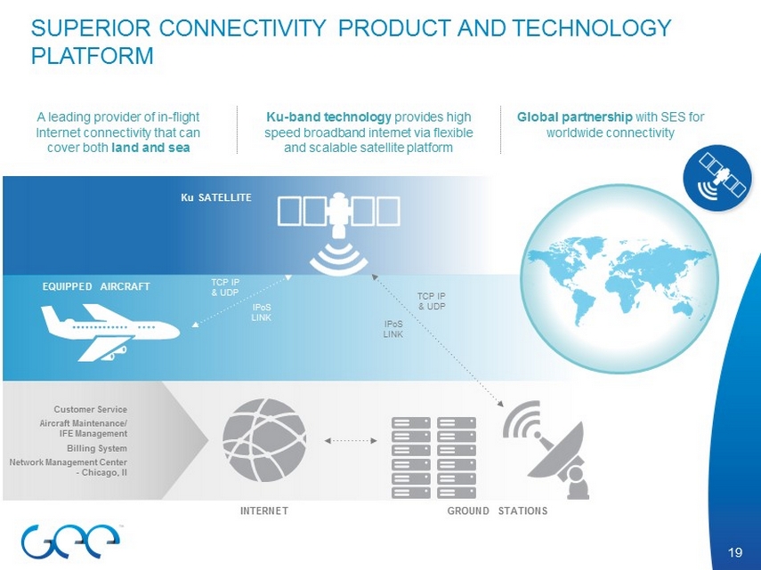 • 653 aircraft installed with GEE connectivity solution as of 3/31/2015 • First global deployed fleet with Ku - band in - flight connectivity • Global partnership with SES provides worldwide Ku - band coverage • Ku High Throughput Satellite (HTS) compatibility, when available • New global Ku antenna under development provides highly efficient operability at all latitudes, including equatorial • World - class network operations center (NOC) • B2B business model with airlines, providing them with greater control over the in - flight passenger experience IN - FLIGHT CONNECTIVITY SYSTEMS 18