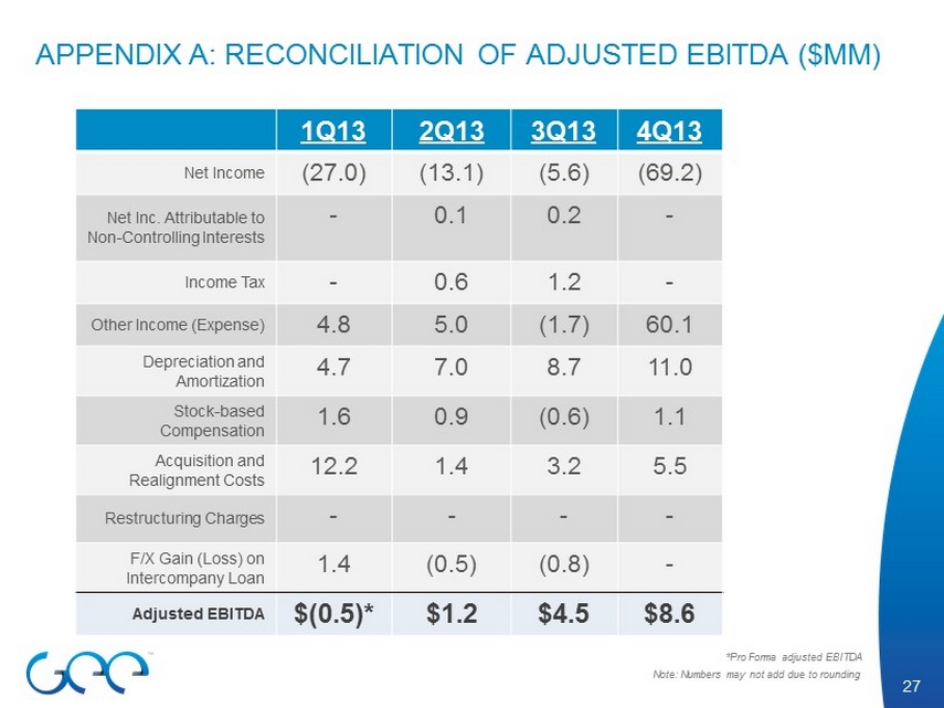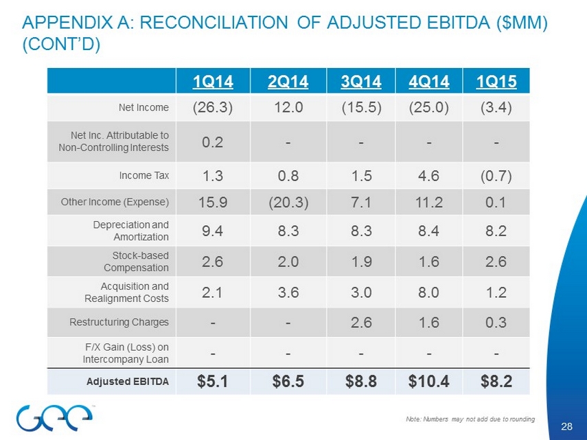 APPENDIX A: RECONCILIATION OF ADJUSTED EBITDA ($MM ) 27 1Q13 2Q13 3Q13 4Q13 Net Income (27.0) (13.1) (5.6) (69.2) Net Inc. Attributable to Non - Controlling Interests - 0.1 0.2 - Income Tax - 0.6 1.2 - Other Income (Expense) 4.8 5.0 (1.7) 60.1 Depreciation and Amortization 4.7 7.0 8.7 11.0 Stock - based Compensation 1.6 0.9 (0.6) 1.1 Acquisition and Realignment Costs 12.2 1.4 3.2 5.5 Restructuring Charges - - - - F/X Gain (Loss) on Intercompany Loan 1.4 (0.5) (0.8) - Adjusted EBITDA $(0.5)* $1.2 $4.5 $8.6 Note: Numbers may not add due to rounding *Pro Forma adjusted EBITDA