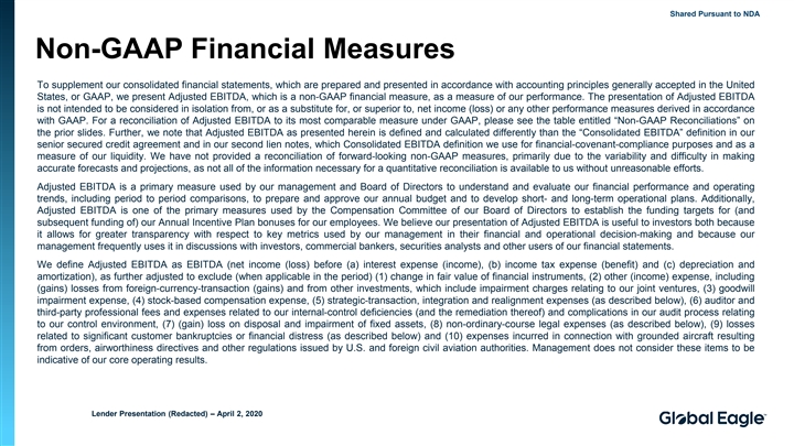 Shared Pursuant to NDA Non-GAAP Financial Measures To supplement our consolidated financial statements, which are prepared and presented in accordance with accounting principles generally accepted in the United States, or GAAP, we present Adjusted EBITDA, which is a non-GAAP financial measure, as a measure of our performance. The presentation of Adjusted EBITDA is not intended to be considered in isolation from, or as a substitute for, or superior to, net income (loss) or any other performance measures derived in accordance with GAAP. For a reconciliation of Adjusted EBITDA to its most comparable measure under GAAP, please see the table entitled “Non-GAAP Reconciliations” on the prior slides. Further, we note that Adjusted EBITDA as presented herein is defined and calculated differently than the “Consolidated EBITDA” definition in our senior secured credit agreement and in our second lien notes, which Consolidated EBITDA definition we use for financial-covenant-compliance purposes and as a measure of our liquidity. We have not provided a reconciliation of forward-looking non-GAAP measures, primarily due to the variability and difficulty in making accurate forecasts and projections, as not all of the information necessary for a quantitative reconciliation is available to us without unreasonable efforts. Adjusted EBITDA is a primary measure used by our management and Board of Directors to understand and evaluate our financial performance and operating trends, including period to period comparisons, to prepare and approve our annual budget and to develop short- and long-term operational plans. Additionally, Adjusted EBITDA is one of the primary measures used by the Compensation Committee of our Board of Directors to establish the funding targets for (and subsequent funding of) our Annual Incentive Plan bonuses for our employees. We believe our presentation of Adjusted EBITDA is useful to investors both because it allows for greater transparency with respect to key metrics used by our management in their financial and operational decision-making and because our management frequently uses it in discussions with investors, commercial bankers, securities analysts and other users of our financial statements. We define Adjusted EBITDA as EBITDA (net income (loss) before (a) interest expense (income), (b) income tax expense (benefit) and (c) depreciation and amortization), as further adjusted to exclude (when applicable in the period) (1) change in fair value of financial instruments, (2) other (income) expense, including (gains) losses from foreign-currency-transaction (gains) and from other investments, which include impairment charges relating to our joint ventures, (3) goodwill impairment expense, (4) stock-based compensation expense, (5) strategic-transaction, integration and realignment expenses (as described below), (6) auditor and third-party professional fees and expenses related to our internal-control deficiencies (and the remediation thereof) and complications in our audit process relating to our control environment, (7) (gain) loss on disposal and impairment of fixed assets, (8) non-ordinary-course legal expenses (as described below), (9) losses related to significant customer bankruptcies or financial distress (as described below) and (10) expenses incurred in connection with grounded aircraft resulting from orders, airworthiness directives and other regulations issued by U.S. and foreign civil aviation authorities. Management does not consider these items to be indicative of our core operating results. Lender Presentation (Redacted) – April 2, 2020Shared Pursuant to NDA Non-GAAP Financial Measures To supplement our consolidated financial statements, which are prepared and presented in accordance with accounting principles generally accepted in the United States, or GAAP, we present Adjusted EBITDA, which is a non-GAAP financial measure, as a measure of our performance. The presentation of Adjusted EBITDA is not intended to be considered in isolation from, or as a substitute for, or superior to, net income (loss) or any other performance measures derived in accordance with GAAP. For a reconciliation of Adjusted EBITDA to its most comparable measure under GAAP, please see the table entitled “Non-GAAP Reconciliations” on the prior slides. Further, we note that Adjusted EBITDA as presented herein is defined and calculated differently than the “Consolidated EBITDA” definition in our senior secured credit agreement and in our second lien notes, which Consolidated EBITDA definition we use for financial-covenant-compliance purposes and as a measure of our liquidity. We have not provided a reconciliation of forward-looking non-GAAP measures, primarily due to the variability and difficulty in making accurate forecasts and projections, as not all of the information necessary for a quantitative reconciliation is available to us without unreasonable efforts. Adjusted EBITDA is a primary measure used by our management and Board of Directors to understand and evaluate our financial performance and operating trends, including period to period comparisons, to prepare and approve our annual budget and to develop short- and long-term operational plans. Additionally, Adjusted EBITDA is one of the primary measures used by the Compensation Committee of our Board of Directors to establish the funding targets for (and subsequent funding of) our Annual Incentive Plan bonuses for our employees. We believe our presentation of Adjusted EBITDA is useful to investors both because it allows for greater transparency with respect to key metrics used by our management in their financial and operational decision-making and because our management frequently uses it in discussions with investors, commercial bankers, securities analysts and other users of our financial statements. We define Adjusted EBITDA as EBITDA (net income (loss) before (a) interest expense (income), (b) income tax expense (benefi