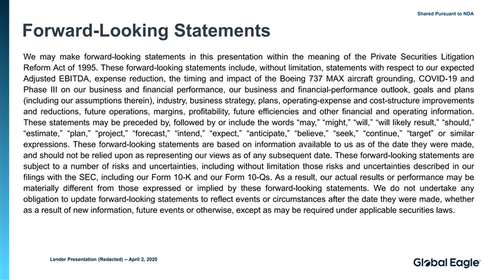 Shared Pursuant to NDA Forward-Looking Statements We may make forward-looking statements in this presentation within the meaning of the Private Securities Litigation Reform Act of 1995. These forward-looking statements include, without limitation, statements with respect to our expected Adjusted EBITDA, expense reduction, the timing and impact of the Boeing 737 MAX aircraft grounding, COVID-19 and Phase III on our business and financial performance, our business and financial-performance outlook, goals and plans (including our assumptions therein), industry, business strategy, plans, operating-expense and cost-structure improvements and reductions, future operations, margins, profitability, future efficiencies and other financial and operating information. These statements may be preceded by, followed by or include the words “may,” “might,” “will,” “will likely result,” “should,” “estimate,” “plan,” “project,” “forecast,” “intend,” “expect,” “anticipate,” “believe,” “seek,” “continue,” “target” or similar expressions. These forward-looking statements are based on information available to us as of the date they were made, and should not be relied upon as representing our views as of any subsequent date. These forward-looking statements are subject to a number of risks and uncertainties, including without limitation those risks and uncertainties described in our filings with the SEC, including our Form 10-K and our Form 10-Qs. As a result, our actual results or performance may be materially different from those expressed or implied by these forward-looking statements. We do not undertake any obligation to update forward-looking statements to reflect events or circumstances after the date they were made, whether as a result of new information, future events or otherwise, except as may be required under applicable securities laws. Lender Presentation (Redacted) – April 2, 2020Shared Pursuant to NDA Forward-Looking Statements We may make forward-looking statements in this presentation within the meaning of the Private Securities Litigation Reform Act of 1995. These forward-looking statements include, without limitation, statements with respect to our expected Adjusted EBITDA, expense reduction, the timing and impact of the Boeing 737 MAX aircraft grounding, COVID-19 and Phase III on our business and financial performance, our business and financial-performance outlook, goals and plans (including our assumptions therein), industry, business strategy, plans, operating-expense and cost-structure improvements and reductions, future operations, margins, profitability, future efficiencies and other financial and operating information. These statements may be preceded by, followed by or include the words “may,” “might,” “will,” “will likely result,” “should,” “estimate,” “plan,” “project,” “forecast,” “intend,” “expect,” “anticipate,” “believe,” “seek,” “continue,” “target” or similar expressions. These forward-looking statements are based on information available to us as of the date they were made, and should not be relied upon as representing our views as of any subsequent date. These forward-looking statements are subject to a number of risks and uncertainties, including without limitation those risks and uncertainties described in our filings with the SEC, including our Form 10-K and our Form 10-Qs. As a result, our actual results or performance may be materially different from those expressed or implied by these forward-looking statements. We do not undertake any obligation to update forward-looking statements to reflect events or circumstances after the date they were made, whether as a result of new information, future events or otherwise, except as may be required under applicable securities laws. Lender Presentation (Redacted) – April 2, 2020