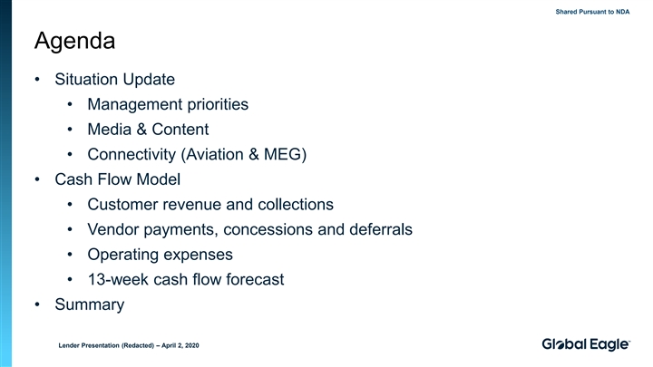 Shared Pursuant to NDA Agenda • Situation Update • Management priorities • Media & Content • Connectivity (Aviation & MEG) • Cash Flow Model • Customer revenue and collections • Vendor payments, concessions and deferrals • Operating expenses • 13-week cash flow forecast • Summary Lender Presentation (Redacted) – April 2, 2020Shared Pursuant to NDA Agenda • Situation Update • Management priorities • Media & Content • Connectivity (Aviation & MEG) • Cash Flow Model • Customer revenue and collections • Vendor payments, concessions and deferrals • Operating expenses • 13-week cash flow forecast • Summary Lender Presentation (Redacted) – April 2, 2020