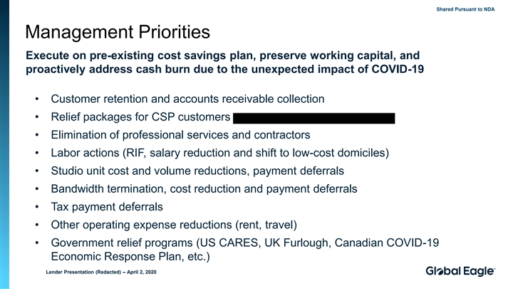 Shared Pursuant to NDA Management Priorities Execute on pre-existing cost savings plan, preserve working capital, and proactively address cash burn due to the unexpected impact of COVID-19 • Customer retention and accounts receivable collection • Relief packages for CSP customers • Elimination of professional services and contractors • Labor actions (RIF, salary reduction and shift to low-cost domiciles) • Studio unit cost and volume reductions, payment deferrals • Bandwidth termination, cost reduction and payment deferrals • Tax payment deferrals • Other operating expense reductions (rent, travel) • Government relief programs (US CARES, UK Furlough, Canadian COVID-19 Economic Response Plan, etc.) Lender Presentation (Redacted) – April 2, 2020Shared Pursuant to NDA Management Priorities Execute on pre-existing cost savings plan, preserve working capital, and proactively address cash burn due to the unexpected impact of COVID-19 • Customer retention and accounts receivable collection • Relief packages for CSP customers • Elimination of professional services and contractors • Labor actions (RIF, salary reduction and shift to low-cost domiciles) • Studio unit cost and volume reductions, payment deferrals • Bandwidth termination, cost reduction and payment deferrals • Tax payment deferrals • Other operating expense reductions (rent, travel) • Government relief programs (US CARES, UK Furlough, Canadian COVID-19 Economic Response Plan, etc.) Lender Presentation (Redacted) – April 2, 2020