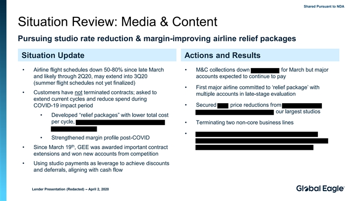 Shared Pursuant to NDA Situation Review: Media & Content Pursuing studio rate reduction & margin-improving airline relief packages Situation Update Actions and Results • Airline flight schedules down 50-80% since late March • M&C collections down for March but major and likely through 2Q20, may extend into 3Q20 accounts expected to continue to pay (summer flight schedules not yet finalized) • First major airline committed to ‘relief package’ with • Customers have not terminated contracts; asked to multiple accounts in late-stage evaluation extend current cycles and reduce spend during • Secured price reductions from COVID-19 impact period our largest studios • Developed “relief packages” with lower total cost per cycle, • Terminating two non-core business lines • • Strengthened margin profile post-COVID th • Since March 19 , GEE was awarded important contract extensions and won new accounts from competition • Using studio payments as leverage to achieve discounts and deferrals, aligning with cash flow Lender Presentation (Redacted) – April 2, 2020Shared Pursuant to NDA Situation Review: Media & Content Pursuing studio rate reduction & margin-improving airline relief packages Situation Update Actions and Results • Airline flight schedules down 50-80% since late March • M&C collections down for March but major and likely through 2Q20, may extend into 3Q20 accounts expected to continue to pay (summer flight schedules not yet finalized) • First major airline committed to ‘relief package’ with • Customers have not terminated contracts; asked to multiple accounts in late-stage evaluation extend current cycles and reduce spend during • Secured price reductions from COVID-19 impact period our largest studios • Developed “relief packages” with lower total cost per cycle, • Terminating two non-core business lines • • Strengthened margin profile post-COVID th • Since March 19 , GEE was awarded important contract extensions and won new accounts from competition • Using studio payments as leverage to achieve discounts and deferrals, aligning with cash flow Lender Presentation (Redacted) – April 2, 2020