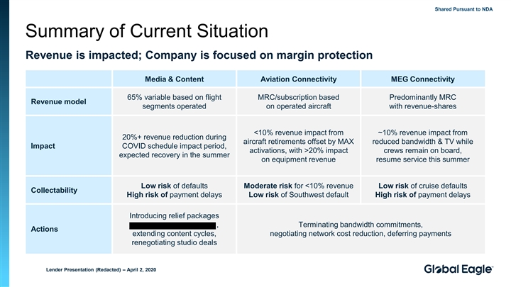 Shared Pursuant to NDA Summary of Current Situation Revenue is impacted; Company is focused on margin protection Media & Content Aviation Connectivity MEG Connectivity 65% variable based on flight MRC/subscription based Predominantly MRC Revenue model segments operated on operated aircraft with revenue-shares <10% revenue impact from ~10% revenue impact from 20%+ revenue reduction during aircraft retirements offset by MAX reduced bandwidth & TV while Impact COVID schedule impact period, activations, with >20% impact crews remain on board, expected recovery in the summer on equipment revenue resume service this summer Low risk of defaults Moderate risk for <10% revenue Low risk of cruise defaults Collectability High risk of payment delays Low risk of Southwest default High risk of payment delays Introducing relief packages , Terminating bandwidth commitments, Actions extending content cycles, negotiating network cost reduction, deferring payments renegotiating studio deals Lender Presentation (Redacted) – April 2, 2020Shared Pursuant to NDA Summary of Current Situation Revenue is impacted; Company is focused on margin protection Media & Content Aviation Connectivity MEG Connectivity 65% variable based on flight MRC/subscription based Predominantly MRC Revenue model segments operated on operated aircraft with revenue-shares <10% revenue impact from ~10% revenue impact from 20%+ revenue reduction during aircraft retirements offset by MAX reduced bandwidth & TV while Impact COVID schedule impact period, activations, with >20% impact crews remain on board, expected recovery in the summer on equipment revenue resume service this summer Low risk of defaults Moderate risk for <10% revenue Low risk of cruise defaults Collectability High risk of payment delays Low risk of Southwest default High risk of payment delays Introducing relief packages , Terminating bandwidth commitments, Actions extending content cycles, negotiating network cost reduction, deferring payments renegotiating studio deals Lender Presentation (Redacted) – April 2, 2020