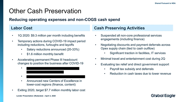 Shared Pursuant to NDA Other Cash Preservation Reducing operating expenses and non-COGS cash spend Labor Cost Cash Preserving Activities • 1Q 2020: $9.3 million per month including benefits • Suspended all non-core professional services engagements (including finance) • Temporary actions during COVID-19 impact period including reductions, furloughs and layoffs • Negotiating discounts and payment deferrals across Opex supply chain (tied to cash outflow) • Salary reductions announced (20-33%) • Significant traction in facilities, IT services • $1.6 million monthly benefit • Minimal travel and entertainment cost during 2Q • Accelerating permanent Phase III headcount changes to position the business after COVID-19 • Evaluating tax relief and direct government support • • Payroll tax subsidy and deferrals • Reduction in cash taxes due to lower revenue • • Announced new Centers of Excellence in lower-cost regions (finance, content) • Exiting 2020, target $7.7 million monthly labor cost Lender Presentation (Redacted) – April 2, 2020Shared Pursuant to NDA Other Cash Preservation Reducing operating expenses and non-COGS cash spend Labor Cost Cash Preserving Activities • 1Q 2020: $9.3 million per month including benefits • Suspended all non-core professional services engagements (including finance) • Temporary actions during COVID-19 impact period including reductions, furloughs and layoffs • Negotiating discounts and payment deferrals across Opex supply chain (tied to cash outflow) • Salary reductions announced (20-33%) • Significant traction in facilities, IT services • $1.6 million monthly benefit • Minimal travel and entertainment cost during 2Q • Accelerating permanent Phase III headcount changes to position the business after COVID-19 • Evaluating tax relief and direct government support • • Payroll tax subsidy and deferrals • Reduction in cash taxes due to lower revenue • • Announced new Centers of Excellence in lower-cost regions (finance, content) • Exiting 2020, target $7.7 million monthly labor cost Lender Presentation (Redacted) – April 2, 2020