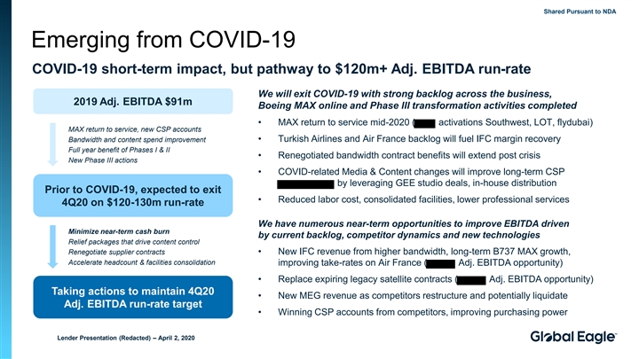 Shared Pursuant to NDA Emerging from COVID-19 COVID-19 short-term impact, but pathway to $120m+ Adj. EBITDA run-rate We will exit COVID-19 with strong backlog across the business, 2019 Adj. EBITDA $91m Boeing MAX online and Phase III transformation activities completed • MAX return to service mid-2020 ( activations Southwest, LOT, flydubai) MAX return to service, new CSP accounts Bandwidth and content spend improvement • Turkish Airlines and Air France backlog will fuel IFC margin recovery Full year benefit of Phases I & II • Renegotiated bandwidth contract benefits will extend post crisis New Phase III actions • COVID-related Media & Content changes will improve long-term CSP by leveraging GEE studio deals, in-house distribution Prior to COVID-19, expected to exit • Reduced labor cost, consolidated facilities, lower professional services 4Q20 on $120-130m run-rate We have numerous near-term opportunities to improve EBITDA driven Minimize near-term cash burn by current backlog, competitor dynamics and new technologies Relief packages that drive content control Renegotiate supplier contracts • New IFC revenue from higher bandwidth, long-term B737 MAX growth, Accelerate headcount & facilities consolidation improving take-rates on Air France ( Adj. EBITDA opportunity) • Replace expiring legacy satellite contracts ( Adj. EBITDA opportunity) Taking actions to maintain 4Q20 • New MEG revenue as competitors restructure and potentially liquidate Adj. EBITDA run-rate target • Winning CSP accounts from competitors, improving purchasing power Lender Presentation (Redacted) – April 2, 2020Shared Pursuant to NDA Emerging from COVID-19 COVID-19 short-term impact, but pathway to $120m+ Adj. EBITDA run-rate We will exit COVID-19 with strong backlog across the business, 2019 Adj. EBITDA $91m Boeing MAX online and Phase III transformation activities completed • MAX return to service mid-2020 ( activations Southwest, LOT, flydubai) MAX return to service, new CSP accounts Bandwidth and content spend improvement • Turkish Airlines and Air France backlog will fuel IFC margin recovery Full year benefit of Phases I & II • Renegotiated bandwidth contract benefits will extend post crisis New Phase III actions • COVID-related Media & Content changes will improve long-term CSP by leveraging GEE studio deals, in-house distribution Prior to COVID-19, expected to exit • Reduced labor cost, consolidated facilities, lower professional services 4Q20 on $120-130m run-rate We have numerous near-term opportunities to improve EBITDA driven Minimize near-term cash burn by current backlog, competitor dynamics and new technologies Relief packages that drive content control Renegotiate supplier contracts • New IFC revenue from higher bandwidth, long-term B737 MAX growth, Accelerate headcount & facilities consolidation improving take-rates on Air France ( Adj. EBITDA opportunity) • Replace expiring legacy satellite contracts ( Adj. EBITDA opportunity) Taking actions to maintain 4Q20 • New MEG revenue as competitors restructure and potentially liquidate Adj. EBITDA run-rate target • Winning CSP accounts from competitors, improving purchasing power Lender Presentation (Redacted) – April 2, 2020